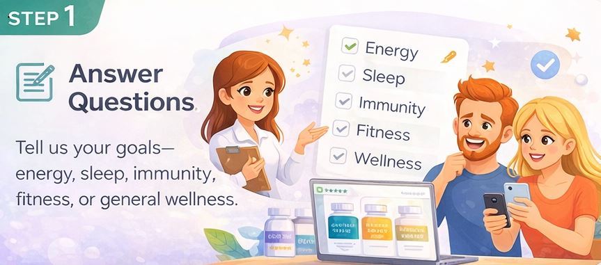 Answer a few questions about your wellness goals. Get non-sponsored supplement recommendations based on ingredients and research—not marketing hype.